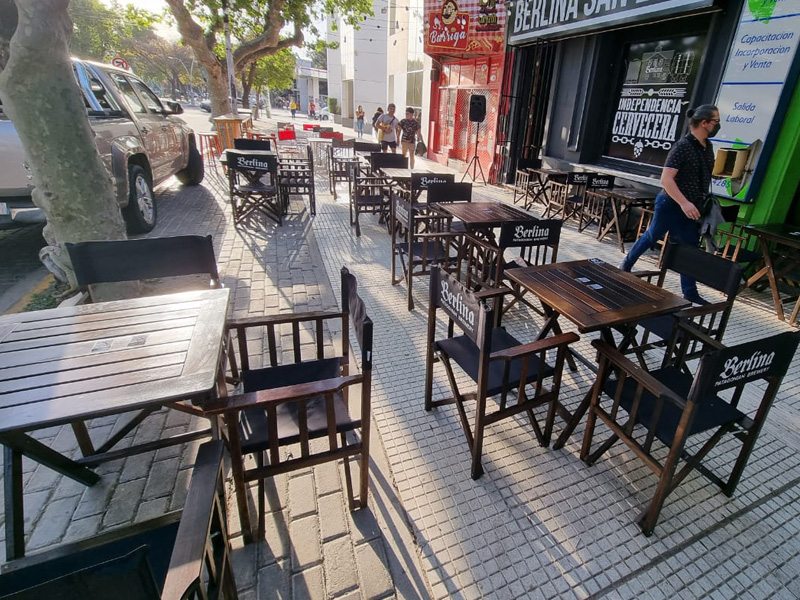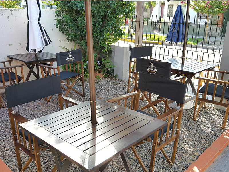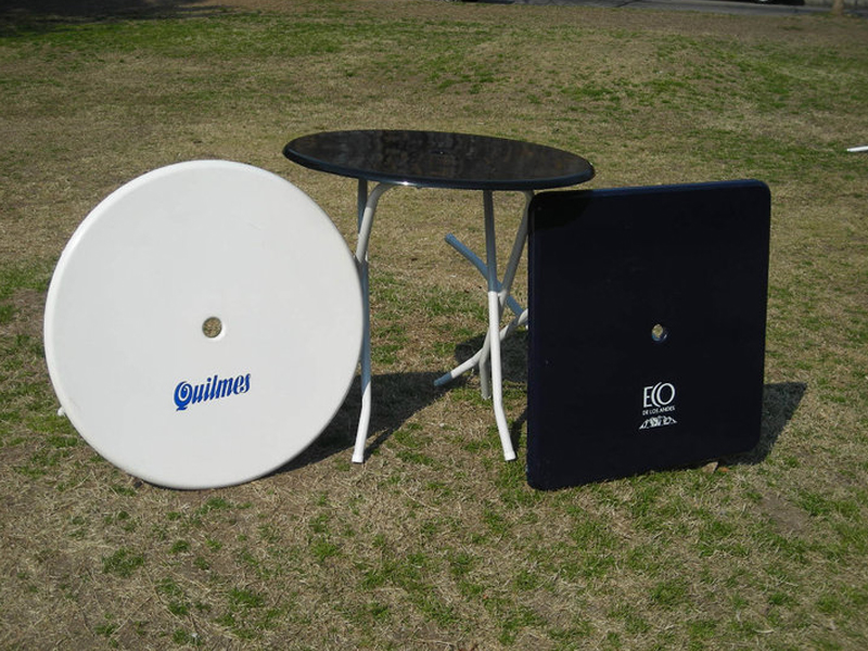 Mesas plegables de madera dura, con o sin agujero para sombrilla. Tablas espigadas y encoladas, tonalizadas y protegidas con laca para exteriores.